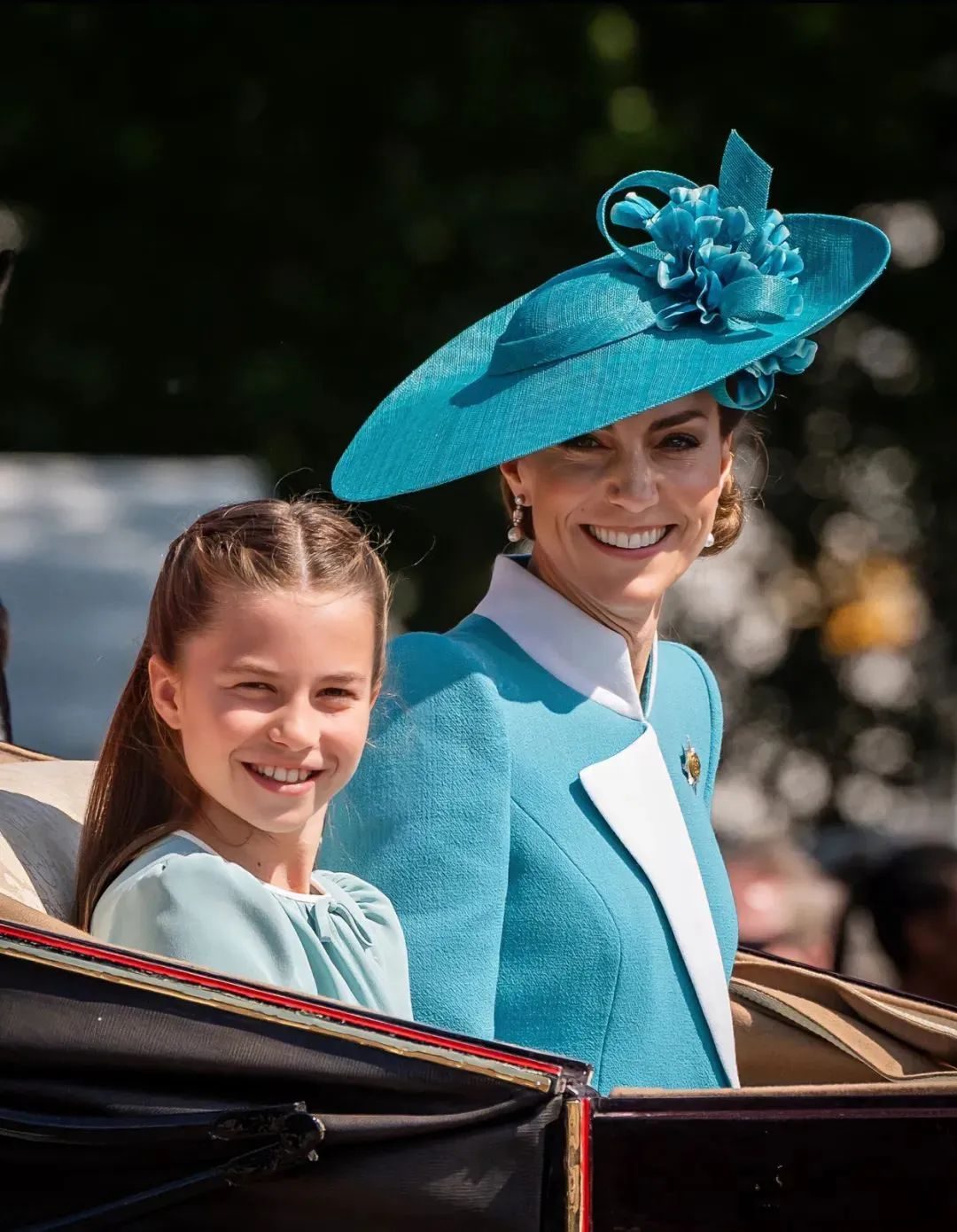 今年6月查尔斯国王生日游行庆典,夏洛特穿着跟妈妈同色系的baby blue连衣裙,戴着曾祖母女王送给她的马蹄形钻石胸针。